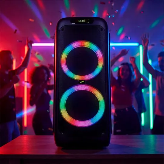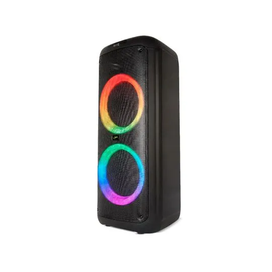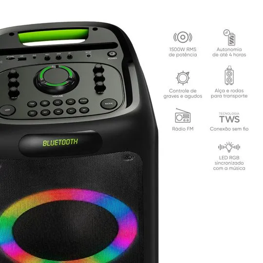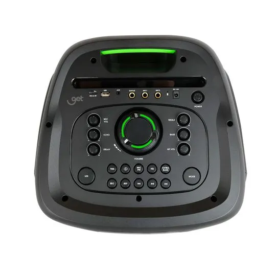 Caixa de Som Bluetooth Get Evoke 1501 conta com função TWS, 1500W RMS de potência e alto falante portátil duplo de 10 polegadas.
