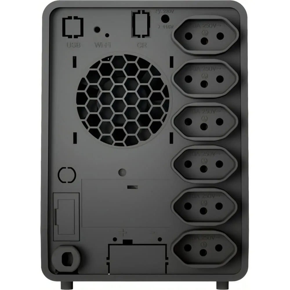 - Alarme audiovisual: sinalização de eventos como queda de rede, subtensão e sobretensão, fim do tempo de autonomia e final de vida útil da bateria, entre outras informações.