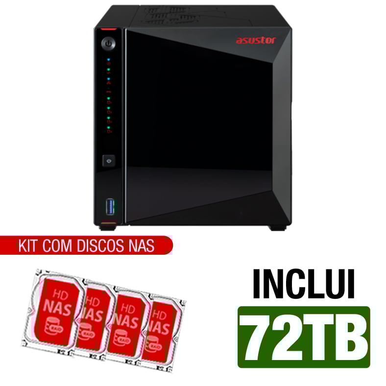 Servidor NAS Asustor AS5404T – 72TB – 4 Slots M.2 para SSDs NVMe – CPU Intel Quad-core 2.0GHz – 4GB RAM – 2x 2.5GbE – Inclui 4 HDs NAS de 18TB -NAC