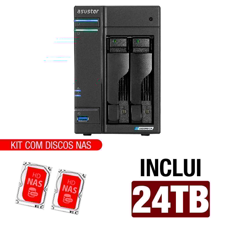 Servidor NAS Asustor AS6702T – 24TB – Intel Quad-Core 2.0 GHz – 4GB DDR4 – 2x 2.5GbE – Inclui 2 HDs NAS de 12TB -NAC