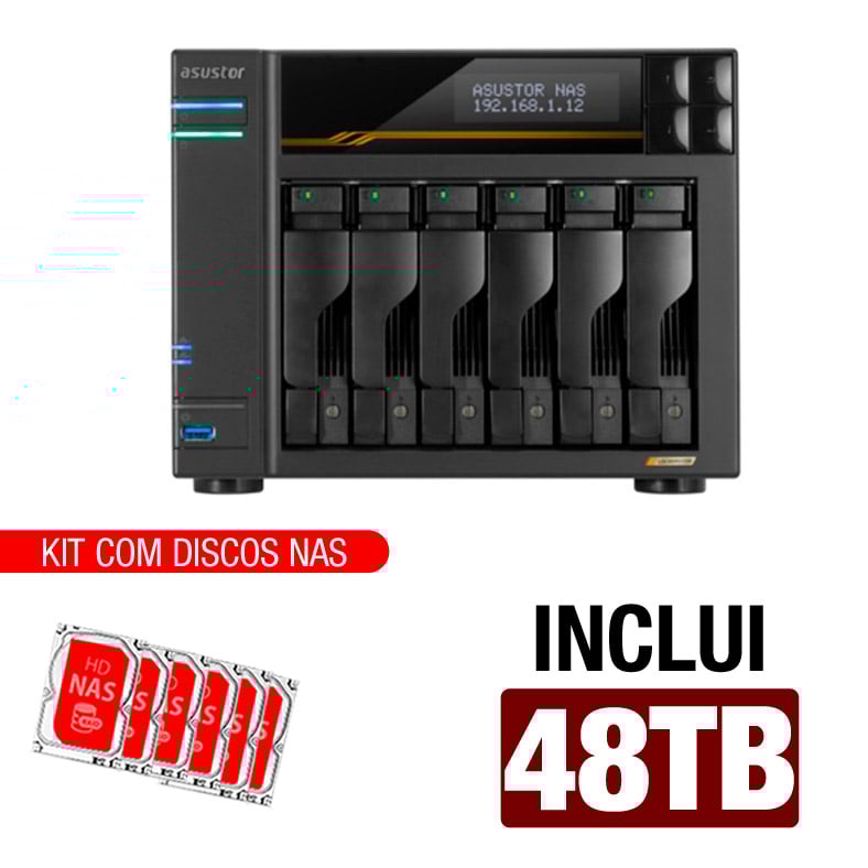 Servidor NAS Asustor AS6806T – 48TB – AMD Ryzen V3C14 – 16GB DDR5 – 2x 10GBe – 2x 2,5 GbE – Inclui 6 HDs NAS de 8TB -NAC