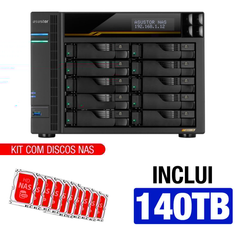 Servidor NAS Asustor AS6810T – 140TB – AMD Ryzen V3C14- 16GB DDR5 – 2x 10GBe – 2x 2,5 GbE – Inclui 10 HDs NAS de 14TB -NAC