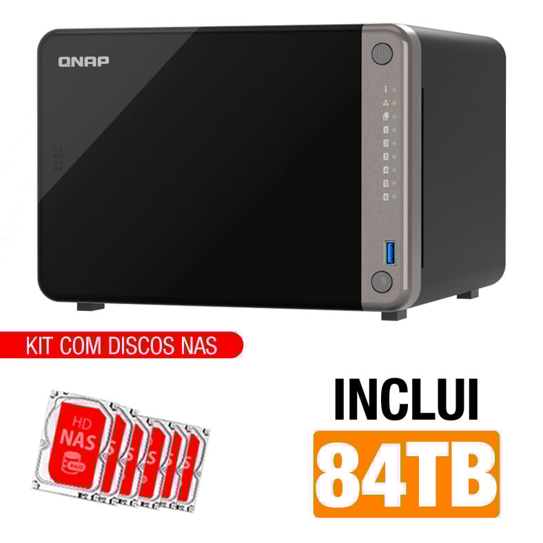 Servidor NAS Qnap TS-AI642 IA – 84TB – ARM Cortex Octa-Core – 8GB RAM – 1x 2.5Gbe – 2x 1Gbe – Inclui 6 HDs NAS de 14TB -NAC