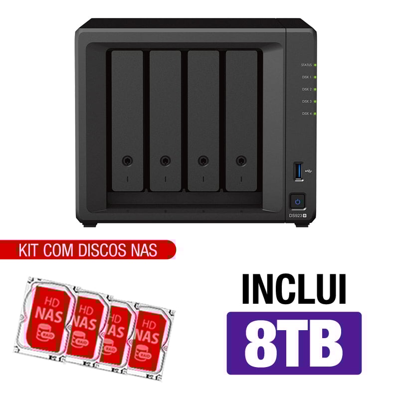 Servidor NAS Synology DS923+ – 8TB – CPU Dual-core 2.6GHz – 4GB DDR4 – 2 Portas 1GbE – Inclui 4 HDs NAS de 2TB -NAC